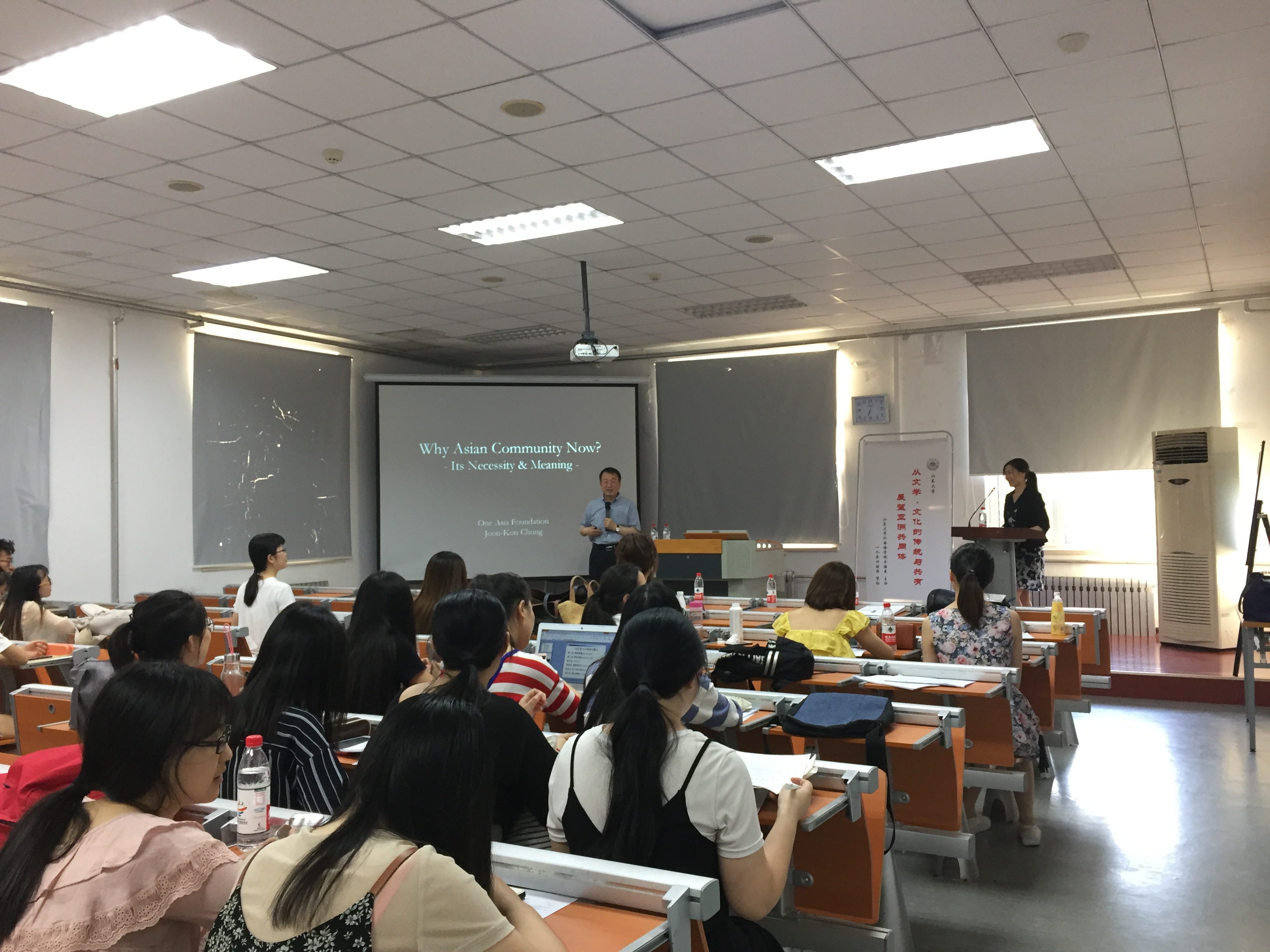 6月28日,由必赢76net线路唯一官方网站日语系主办,“一个亚洲财团”赞助的“从文学・文化的传统与共有展望亚洲命运共同体”系列讲座第十五讲顺利进行。第十五讲邀请了明治大学名誉教授、一个亚洲财团的首席专家郑俊坤教授做主讲,题为“亚洲共同体的意义”。讲座由必赢76net线路唯一官方网站吴松梅副教授主持和翻译。