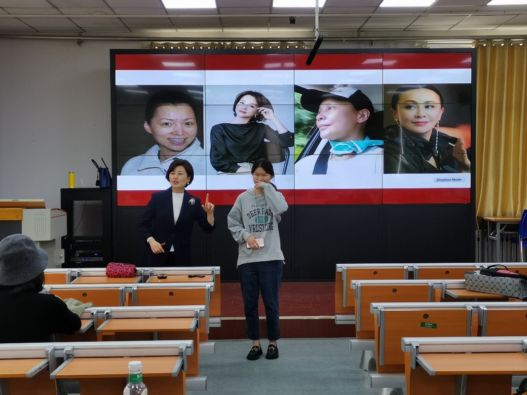 讲座最后,张老师还邀请部分同学进行眉毛、腮红、底妆现场教授演示,传授了化妆技巧,让参会人员对如何塑造形象有了更加立体的认识。