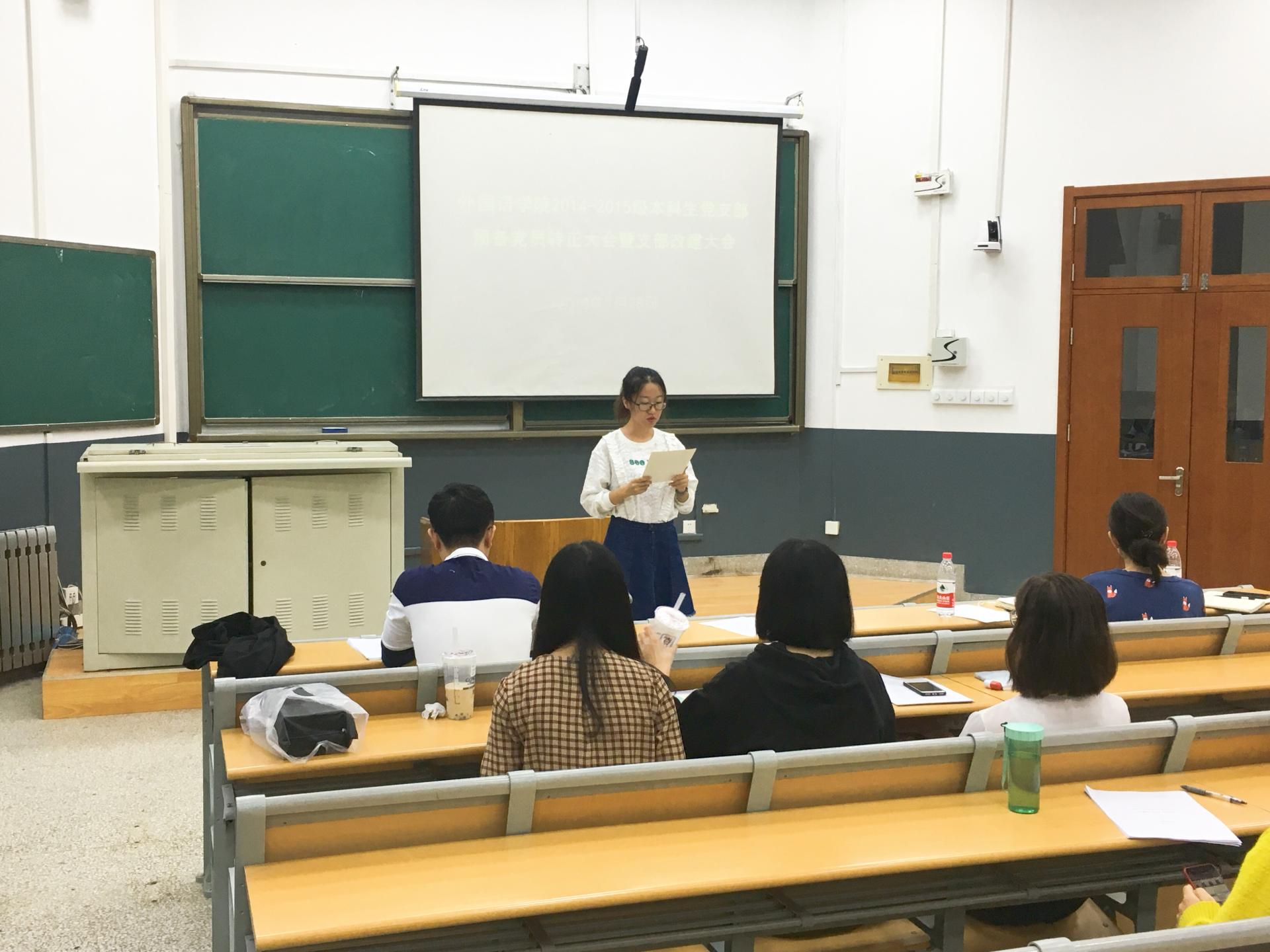 9月28日下午,必赢76net线路唯一官方网站2014-2015级本科生党支部于公教楼108教室召开了党员转正大会暨党支部改建大会。党支部书记刘金帅老师、2016级辅导员朱蕾老师出席了本次大会。