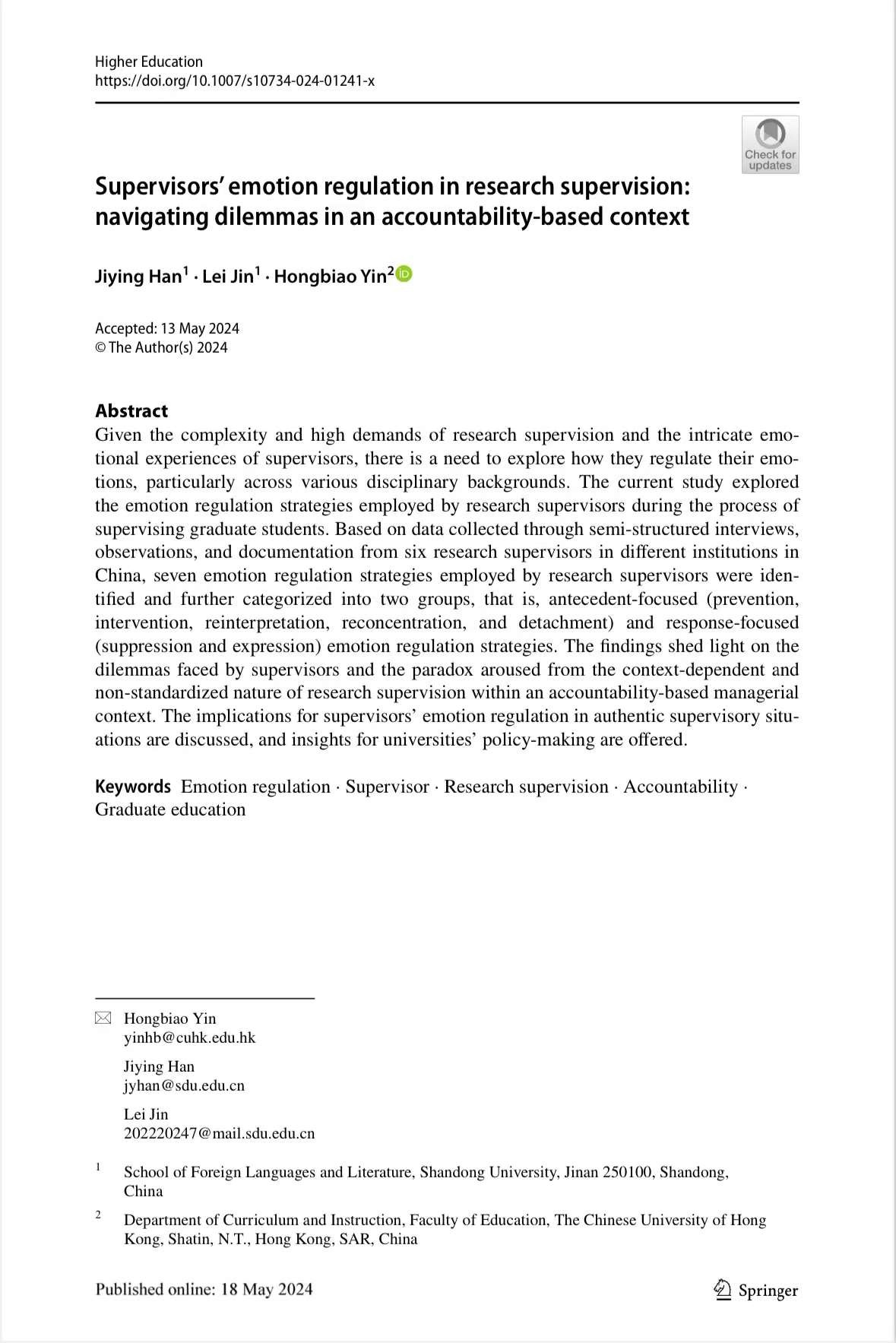 近日,必赢76net线路唯一官方网站韩佶颖教授团队在教育学与教育研究领域SSCI一区顶级期刊Higher Education (2022影响因子:5.0)发表研究生教育的最新研究成果“Supervisors’ emotion regulation in research supervision: navigating dilemmas in an accountability‑based context”。韩佶颖教授为第一作者,2022级博士研究生金蕾为第二作者,必赢76net线路唯一官方网站为第一作者单位。