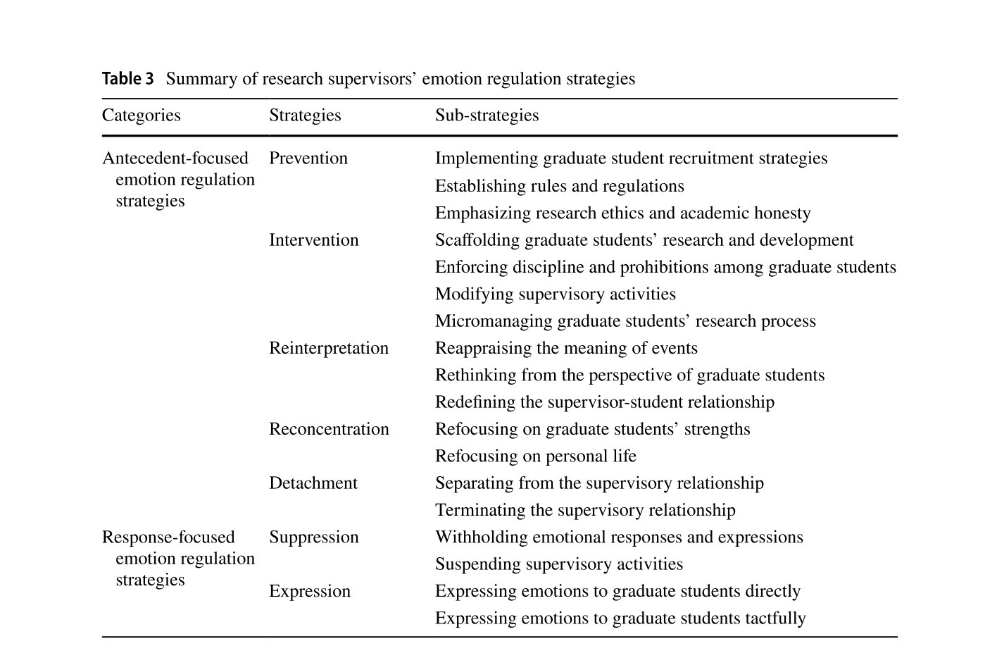 该研究聚焦研究生导师情绪调节策略,通过与六位来自不同学科的博士生导师的深度访谈,结合对导师指导研究生过程(例会等)的非参与式观察,以及为学生论文提供的修改意见等多种资料的收集,揭示了导师在指导研究生过程中采用的两大类共七种情绪调节策略。这些策略分为聚焦前因策略(包括预防、干预、重评、焦点重聚和脱离)与聚焦反应策略(即抑制和表达)。研究结果显示,研究生导师在指导实践中面临着指导风格选择的困境:是采取频繁的干预还是保持相对松散的指导方式?同时,在情绪表达上,导师们也在表达与压抑情绪之间挣扎。在当前导师责任制的管理背景下,研究生指导个性化特征与标准化管理制度之间存在显著矛盾。因此,高校在指定研究生指导政策时,应充分考虑到科研指导指导的人文性与学科特殊性,尊重导师的个性化指导方式,并寻求在标准化管理与个性化指导之间找到平衡。