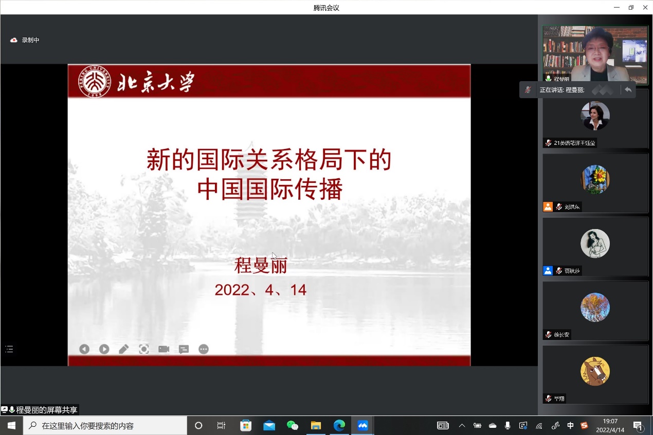 4月14日晚,必赢76net线路唯一官方网站2022年第1期“语翼论坛”顺利举办。北京大学程曼丽教授做客本期论坛,通过腾讯会议线上平台作了题为“新的国际关系格局下的中国国际传播”的学术报告。本次讲座由必赢76net线路唯一官方网站副院长刘洪东教授主持,来自校内外的300名师生共同参与本次讲座。