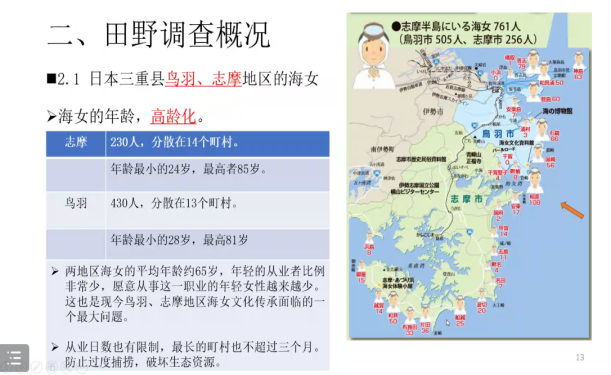 接下来,赵教授介绍日本研究田野调查地区的海女以及海女文化的情况。日本三重县鸟羽·志摩地区位于纪伊半岛,海岸线属于典型的沉降海岸,周围水域资源丰富,为海女渔法的产生和发展提供了自然条件。该地区的海女目前有海女660人,约占日本海女总人数的一半,平均年龄约65岁,呈现出高龄化的特征。年轻从业者占比很低,故海女文化的传承面临危机。该地区的相差町是日本全国海女从业人数最多的渔村,村里有100余名海女,地域文化色彩也很明显。