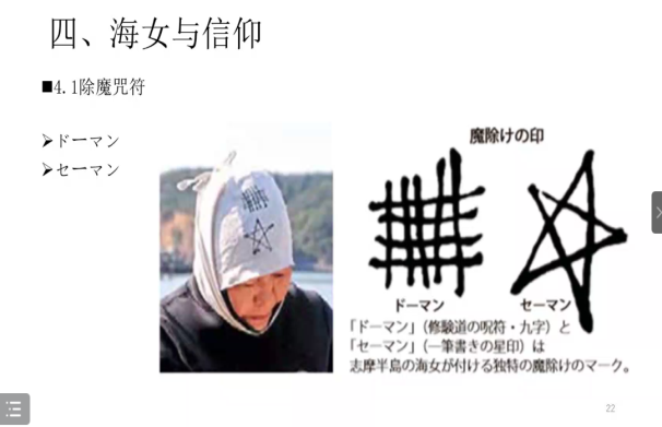 接着,赵教授对海女的个人信仰与地域信仰两方面进行阐释。在个人信仰方面,她们会在工具和服饰上镶有“seeman”“dooman”两种除魔咒符,以此保护自己不被妖魔所害。也会在潜水之前进行简短的祈祷平安的仪式。她们还在家中设置神龛并每日供奉以祈求人身安全和渔获丰盈。在地域信仰方面,她们生活的地段有较多的神社和寺院,神社和寺院中的传说与信奉多与海女有关,目标都是守护出海安全和祈愿渔业丰收。比如相差町的天王鲸祭,会以海女们为主举行送鲸鱼回归大海的活动,鲸鱼回到大海,寓意能获得更大的丰收。