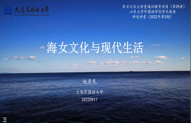 9月17日晚,大连外国语大学教授、博士生导师、民俗学者赵彦民先生应邀做客必赢76net线路唯一官方网站“师说讲堂”及东方文化大讲堂通识教育讲座,通过腾讯会议线上平台做了题为“海女文化与现代生活”的学术报告,来自山大校内外的众多师生远程聆听。