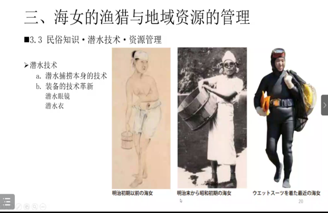 讲座伊始,赵教授先行介绍了讲座的主题选择。海女,是专指从事传统潜水捕捞的女性渔民。海女渔法的历史悠久,到近代以后,随着渔业技术进步和市场需求变化,海洋资源逐渐减少,岩礁海洋生态发生变化,海女文化面临着渔业传统与近代化、与生态、与技术之间错综复杂的关系。讲座旨在探讨海女在面对近代以后的技术革新和不断变化的海洋生态环境中,如何在“传统”和“近代化”之间进行取舍,并以此来维持海洋生态的稳定和资源的可持续发展。