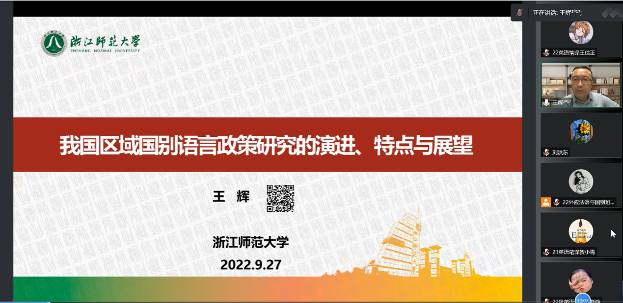 9月27日晚,必赢76net线路唯一官方网站第4期“环球论坛”顺利举办。浙江师范大学王辉教授做客本期论坛,通过腾讯会议线上平台作了题为“我国国别区域语言政策的演进、特点与展望”的学术报告。本次讲座由必赢76net线路唯一官方网站副院长刘洪东教授主持,来自必赢76net线路唯一官方网站的200名师生共同参与本次讲座。