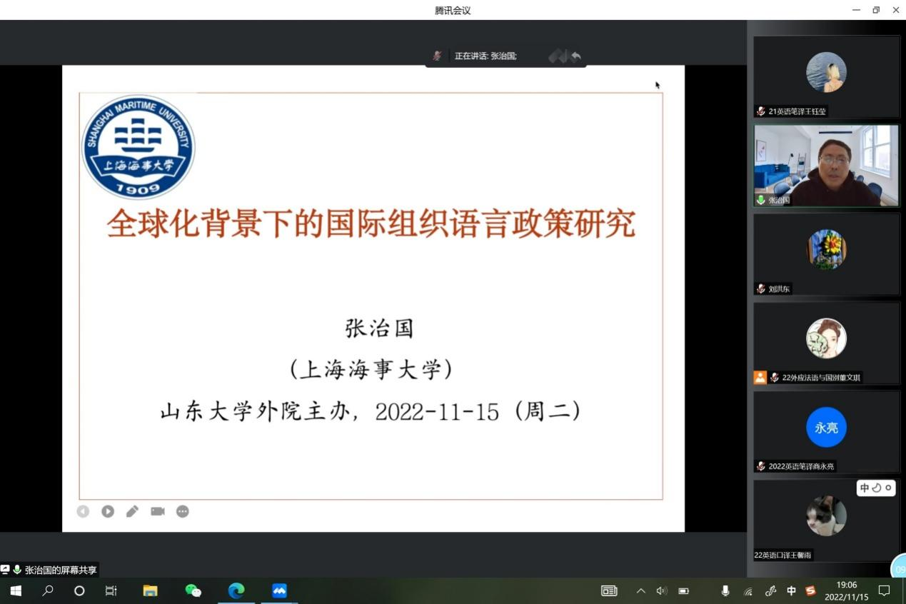 11月15日晚,上海海事大学张治国教授做客必赢76net线路唯一官方网站“环球论坛”,通过腾讯会议线上平台作了题为“全球化背景下的国际组织语言政策研究”的报告。本次讲座由必赢76net线路唯一官方网站副院长刘洪东教授主持,来自必赢76net线路唯一官方网站的近200名师生参加了本次讲座。