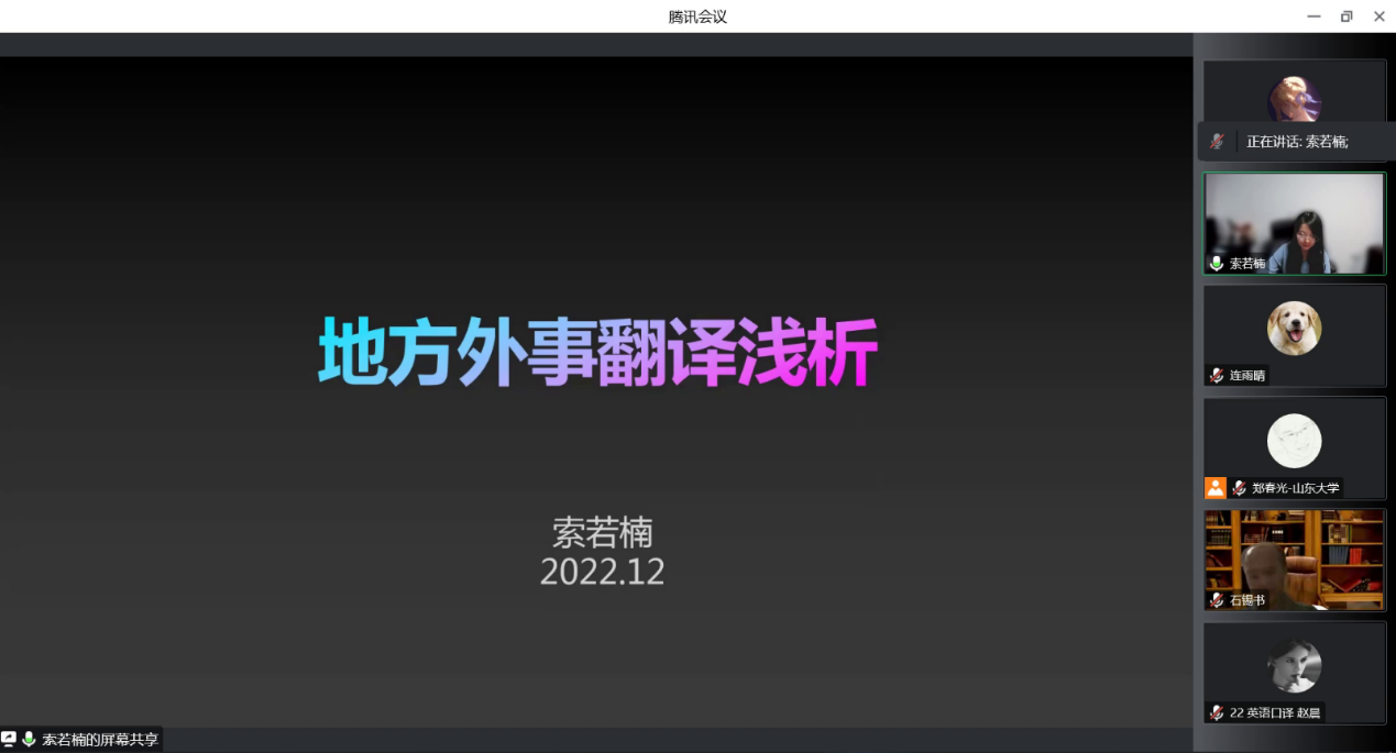 12月2日晚,山东省外事翻译中心副主任索若楠应邀做客必赢76net线路唯一官方网站2022年第2期“洪楼译坛”,通过腾讯会议线上平台作了主题为“地方外事翻译浅析”的学术报告。本次讲座由必赢76net线路唯一官方网站翻译系副研究员郑春光主持,来自校内外的160余名师生共同参与了本次讲座。