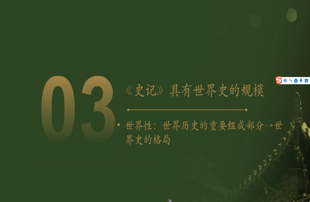 赵教授指出,《史记》不仅具有中国史的规模,也具有世界史的格局。因为《史记》是世界史的重要组成部分,具有人类共通性。司马迁有着世界眼光,在《史记》中记载了许多周边国家和少数民族政体的历史,牵扯到几十个国家之多,涉及到诸多的人和事。相较于古巴比伦、古印度、古埃及的历史记录出现中断,中国的历史记载却给后人留下了翔实丰富的精神财富,世界历史记录有一段时间出现空白,中国历史记录的分量不言自明。因此,《史记》可谓是一部通史,一部重要的世界史!