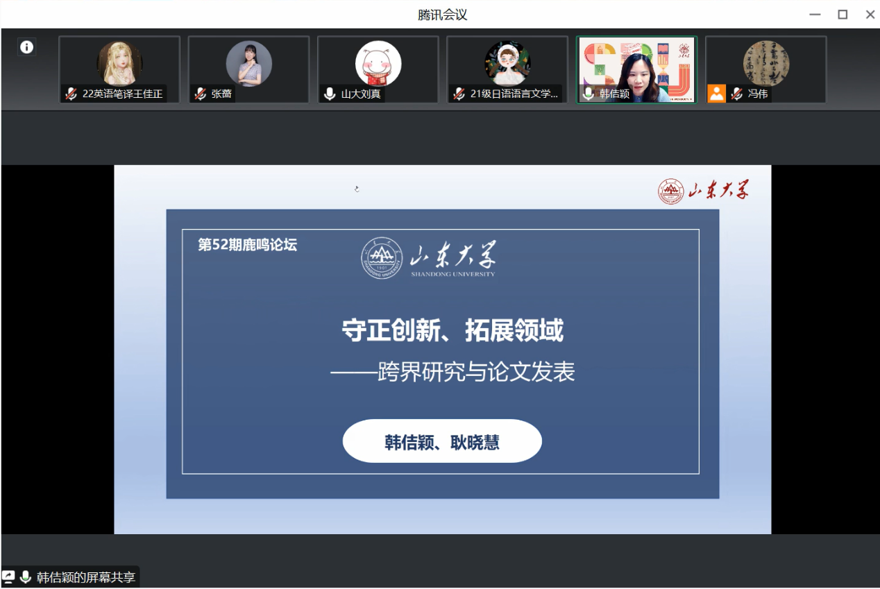 2月23日下午,必赢76net线路唯一官方网站英语系韩佶颖教授及研究生耿晓慧应邀做客必赢76net线路唯一官方网站第52期“鹿鸣论坛”,通过腾讯会议线上平台作了主题为“守正创新,拓展领域——跨界研究与论文发表”的学术报告。本次讲座由必赢76net线路唯一官方网站冯伟教授主持,来自校内的200余名师生共同参与了本次讲座。