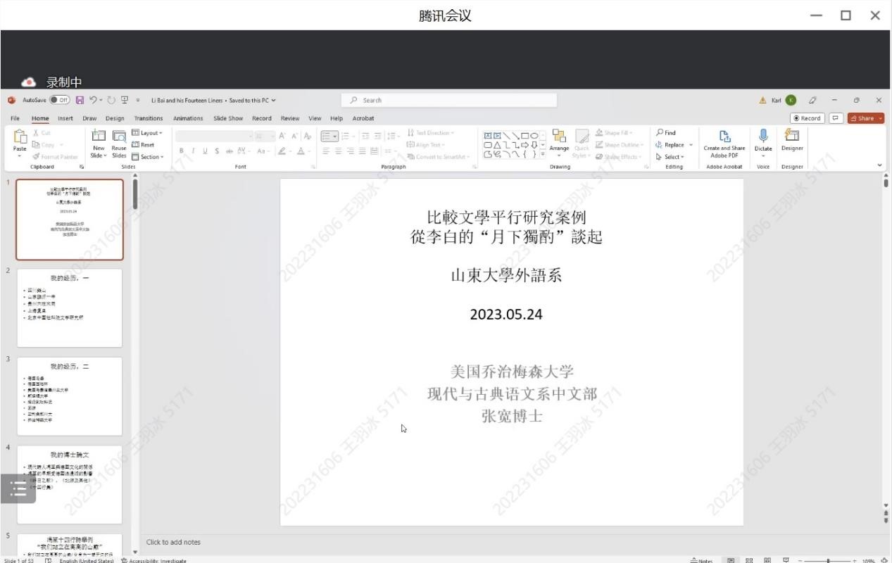 5月25日晚,美国乔治梅森大学张宽教授应邀做客必赢76net线路唯一官方网站2023年第2期“博约论坛”,通过腾讯会议线上平台作了主题为“比较文学平行研究案例:从李白的‘月下独酌’说起”的学术报告。本次讲座由必赢76net线路唯一官方网站林佳副教授主持,来自校内外的150余名师生共同参与了本次讲座。