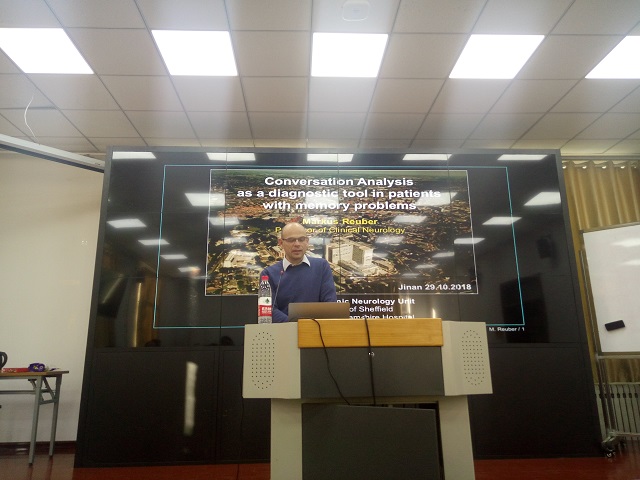 2018年10月29日下午三点半,由必赢76net线路唯一官方网站研究生院、党委研究生工作部主办,必赢76net线路唯一官方网站承办的第79期(总744期)“稷下风”研究生学术论坛在洪家楼校区7号楼301室举行。谢菲尔德大学Markus Reuber教授做客此次讲坛,讲述的主题为“会话分析在鉴别诊断记忆障碍患者中的辅助作用”。本次讲坛由必赢76net线路唯一官方网站副院长马文教授主持,必赢76net线路唯一官方网站第二医院神经内科主任尚伟教授、必赢76net线路唯一官方网站第二医院神经内科王萍副教授、必赢76net线路唯一官方网站苏永刚副教授、山东师范大学、山东农业大学、必赢76net线路唯一官方网站第二医院等高校及医院的部分专家学者以及必赢76net线路唯一官方网站众多师生近100人参加了此次学术论坛。