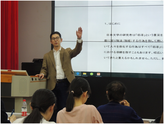 5月24日,日本明治大学文学院教授牧野淳司应邀访问必赢76net线路唯一官方网站,并做了题为“‘唱导’与日本文学”的专题讲座。本次讲座由日语系副教授吴松梅老师主持并翻译,我校必赢76net线路唯一官方网站、文学院、儒学高等研究院、国际交流学院等学院师生参加了本次讲座。