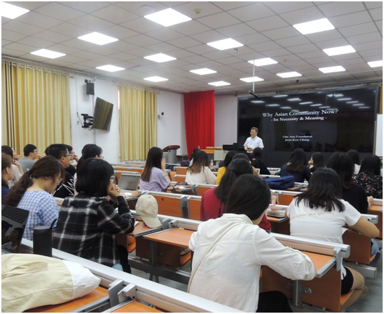 讲座伊始,郑俊坤教授谈到在当前形势下亚洲共同体的必要性和意义,指出每个人都会从不同的视点来看待和理解亚洲,因此就会出现各种不同的亚洲认识。同时,在关顾一个国家或者区域时,选择不同的“时间”也会造成不同的认知。我们要从不同的时间全方位地来看待一个国家,只有了解一个国家的过去才能够正确把握现在,并在此基础上展望亚洲的未来。为了说明这一点,郑教授为同学们列举了一个切身体会,在蒙古大学的一次讲座中,他问及当地学生们是否对韩国和日本感兴趣,以及是否去过这两个国家时,原以为应该只有寥寥数人举手,但出乎意料,讲座里有一半的学生都去过韩国或日本。结合这个例子郑俊坤教授提到不能仅从经济角度或者说当前的经济实力来判断一个国家,思考亚洲的未来时,应采用多维视角,而不仅仅是关注“现在”,要通过考察其历史来发掘一个国家未来发展的“可能性”。郑俊坤教授强调所谓的“亚洲共同体”并非是一个和国家相悖的概念,相反,是提倡让共同体内的每个国家都发挥更大的作用,超越意识形态、社会制度以及民族、宗教差异的壁垒,从相互封闭到开放包容,从猜忌隔阂到日益增多的互信认同,越来越成为你中有我、我中有你的命运共同体,才能最终实现人类命运共同体的目标,使我们生活的亚洲更加自由、更加和平、更加舒适。这需要年轻学子们的不懈努力。