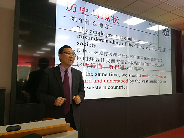 讲座伊始,赵秀福教授对杨俊峰教授的到来表示了热烈欢迎,并简要介绍了杨俊峰教授的研究工作与学术成就。讲座开始后,杨教授首先探讨了“中国特色”如何用英文规范地表达,以此为切入点,提出了我们需要建设什么样的中国特色话语体系的重要问题,并归结于应当建立国际社会可以接受的、有中国特色的话语体系。接着,杨教授分析了中国特色话语体系的历史与现状,指出西方对中国存在认知偏差,构建中国特色话语体系是历史机遇,同时也面临着诸多障碍和挑战。杨教授认为,“一带一路”倡议和中国文化走出去战略凸显了构建中国特色话语体系的重要性,实现中国梦必须解决话语权问题。杨教授认为,中国特色话语体系应当具备三个明显特征,即政治性、真实性和文化性。政治性关系到国家安全、经济、政治和军事的利益得失;真实性要求客观地把中国政治、经济、文化等内容传递给受众,还应努力做到信息等值;文化性则要求译者采取变通的翻译策略,最大程度消除文化障碍。最后,杨教授提出了两个建议,并称之为译文的两个最大限度。第一,要最大限度保留中文意思,使译文不走样,使译者不误读,并用“广交朋友”的译法作为示例;第二,要使表达方式、习惯最大限度地接近英语,对于中国文化、中国政治背景浓郁的内容要采用解释或叙述的方式翻译。杨教授特别强调了汉译英的重要性,鼓励同学们平时多做相关练习。在提问环节,同学们积极发言,杨教授耐心解答了同学们的问题,大家获益良多。