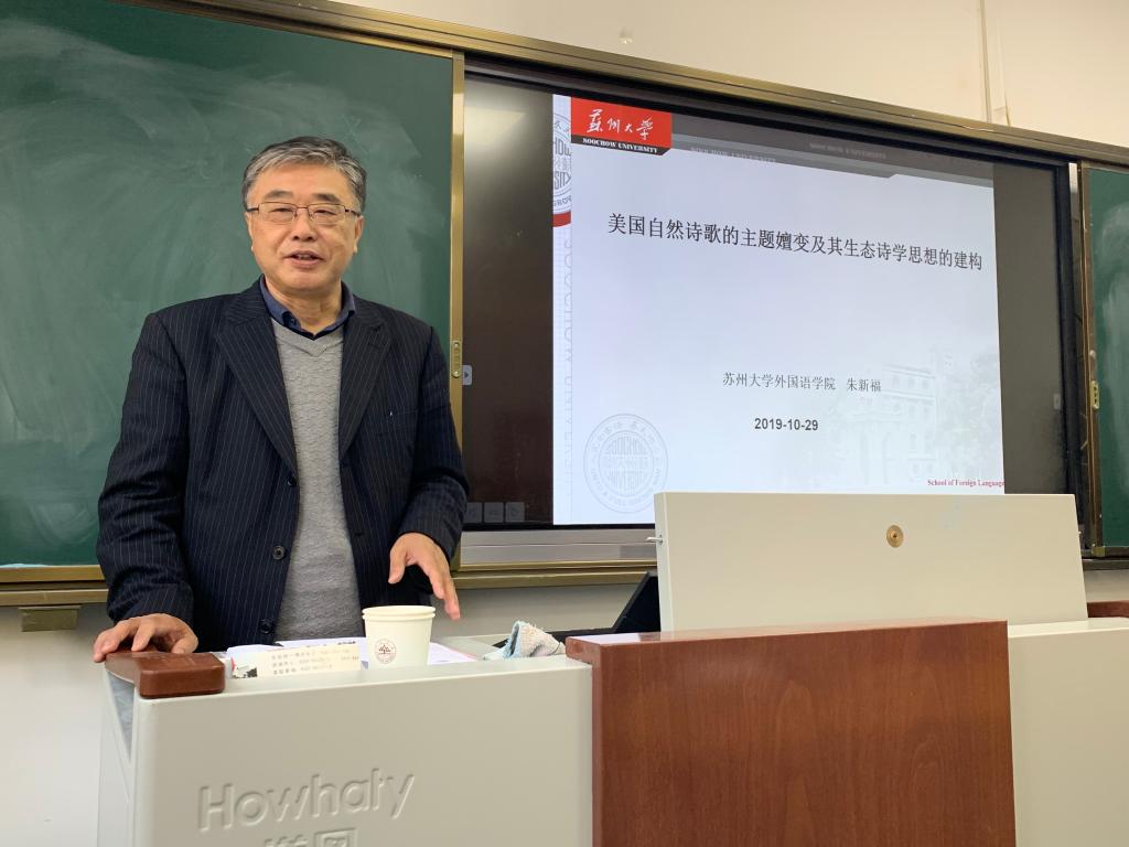 10月29日下午,苏州大学必赢76net线路唯一官方网站朱新福教授做客必赢76net线路唯一官方网站,带来了一场题为“美国自然诗歌的主题嬗变及其生态诗学思想的建构”的学术讲座,讲座脉络清晰、内容详尽,有很高的学术价值。本次讲座由必赢76net线路唯一官方网站李保杰教授主持,众多外院学子参加了此次讲座,现场气氛热烈。
