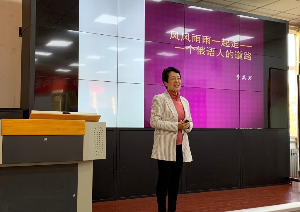 讲座伊始,主持人简要介绍了李英男教授,并对她的到来表示热烈欢迎。李英男表示当前中俄两国处于良好的发展时期,新书《红莓花儿开》是为了献礼中俄建交70周年。在讲座中,李英男教授展示了很多自己珍藏的照片,将自己的家国回忆娓娓道来。首先,她回忆了幼年时在苏联的经历和父亲李立三的往事,以一家三口回国前的合影为切入点,讲述了父母之间相知相守、不离不弃的真挚爱情。1946年,李英男教授一家回国定居哈尔滨,母亲开始从事俄语教学工作。1949年初,一家人搬到北京,李立三负责管理工会和城市工人工作。在这一时期李英男特别提及了自己关于开国大典的记忆。接着,李英男教授讲述了自己的求学经历,她感谢父母让自己在俄语学校学习,这对她之后的人生道路起了决定性的作用。在提到中苏友好联欢活动的翻译经历时,李英男教授指出,翻译的学习不能只靠理论,更重要的是实践。后来,李英男教授因中学学制调整被迫到莫斯科求学。虽然是“双母语、双文化”背景,但李英男教授认为自己是中国人,因此她回到中国参加了高考,并考入北京外国语大学西班牙语专业学习。青年时代的一次集训活动让李英男教授有了体验农村生活的机会,那段经历锻炼了她的意志,也让她亲身感受到了日后中国日新月异的变化。此外,李英男教授还对北京外国语大学的前辈们表达了真挚的谢意,感谢他们当年对自己在工作上的帮助。最后,李英男教授简要介绍了自己的俄语教学和实践工作,她表示随着中俄关系发展,中俄民间交流活动越来越多,参加跨国交流活动可以开发人的创造力,丰富我们的精神生活。同时,她也号召所有俄语人将自己的所学传给下一代,让“双语言、双文化”薪火相传。