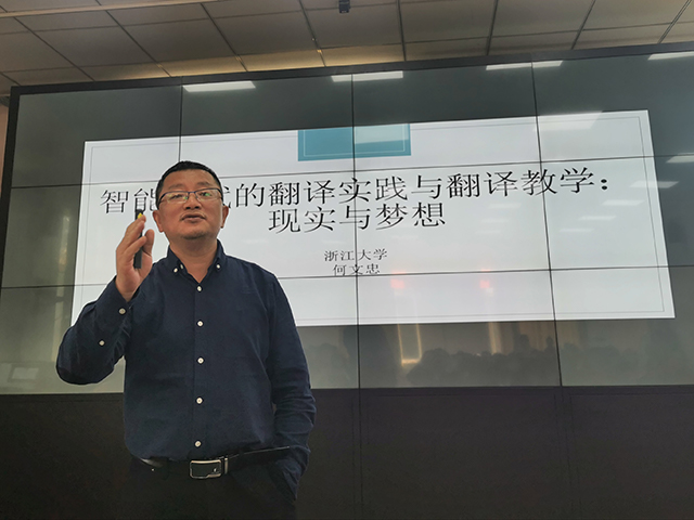11月5日上午,必赢76net线路唯一官方网站举办了博士研究生高端学术报告会,浙江大学何文忠教授作了题为“智能时代翻译实践与翻译教学:现实与梦想”的学术报告,高屋建瓴,发人深思。必赢76net线路唯一官方网站副院长马文教授主持了此次讲座,外院师生一百多人聆听了讲座,收获颇丰。