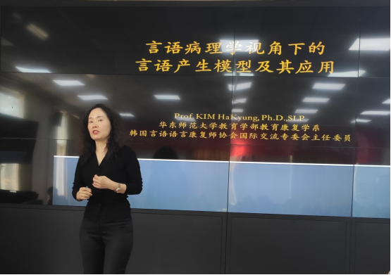 金河庚指出,中国语言康复行业还处在初期阶段,面临着飞速发展期,具有广阔的探索空间。她通过分析腭裂的例子,引出并探讨了言语产生的正常流程,即呼吸,发声,构音,共鸣四部分,这四个部分环环相扣,相互影响。她指出,在呼吸方面,脑瘫患者往往存在呼吸障碍;在发声方面,吸烟人士常常出现嘶哑声;她借助中国各地方言的差异阐释了舌位对构音的重要影响;现场演示了共鸣障碍的外在表现,阐释了其中的原因。金河庚对语言障碍患者的症状进行了真实还原,细致分析了各类言语障碍,包括口吃、嗓音、构音以及韵律方面的问题。她阐释深入浅出,引发了听众极大兴趣,令人印象深刻。随后,金河庚重点厘清了speech(言语)和language(语言)的概念,并指出了在评估以及康复方面的差异。金河庚在言语康复领域临床经验丰富,她通过分享言语障碍治疗实例,强调针对不同的障碍类型要对症治疗,比如针对脑瘫患者和失语症患者的康复训练策略迥然不同,进而她全面梳理了言语障碍诊疗过程——从听力检查到符合国际标准(OSMSE-R)的口部运动评估的整个过程。讲座最后,金河庚希望同学们多多关注言语障碍方面研究,对中国言语病理学的发展报以深切期待。