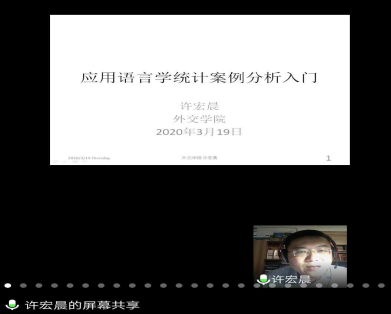 3月19日晚,作为“九十周年院庆系列活动”之一,必赢76net线路唯一官方网站线上系列学术报告第二场成功举办。应必赢76net线路唯一官方网站的邀请,外交学院许宏晨教授利用线上平台(腾讯会议),为外院师生作了题为 “应用语言学统计案例分析入门”的学术报告,高屋建瓴,深入浅出。必赢76net线路唯一官方网站副教授邵春燕担任主持人,260余名外院师生聆听了此次讲座。