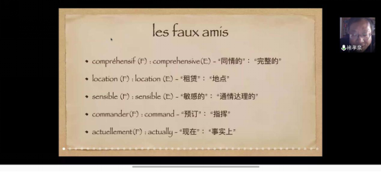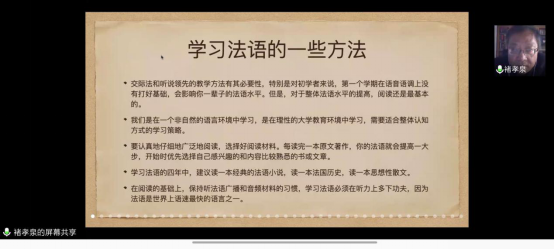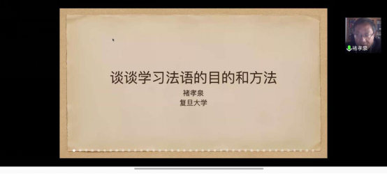 互动环节,同学们踊跃提问,畅所欲言,从学习瓶颈期的应对,到毕业后维持法语学习的方法,教授也一一悉心解答。整场讲座虽仅由网络相通,但教授的儒雅亲切让大家都如沐春风,接地气的方法指导又令人茅塞顿开。最后,大家共同约定,疫情过后再聚首美丽山大,静待花开。
