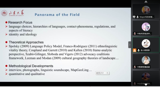讲座后半部分,姜仁风介绍了他的实例研究:社交媒体中都柏林城市语言景观研究。他从研究问题、理论支持、研究方法、研究预期、研究局限性和未来研究六个方面对此实例进行了细致描述。姜仁风指出自己的研究问题一是从语言丰富度和多样性描述都柏林的虚拟语言景观,二是研究这些虚拟语言景观随时间如何变化。他还详细介绍了如何在Instagram进行数据采集、如何进行数据分析,以及如何利用Python进行数据处理。此研究预期主要包括研究三年来Instagram用户的语言分布、用户语言选择和虚拟语言景观的多样性。姜仁风最后指出,目前国内虚拟语言景观研究的局限性是只针对单语进行研究,且研究方向和国际市场有所偏离。报告分享结束后,同学老师们积极提问,姜仁风针对这些问题一一进行回复。