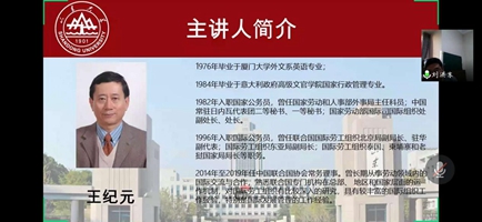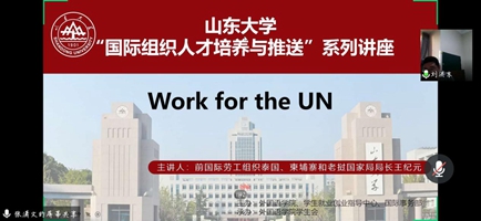 为进一步推进学校国际组织人才培养与推送工作,5月26日晚,由国际事务部、学生就业创业指导中心与必赢76net线路唯一官方网站联合举办的以“WORK FOR THE UN(为联合国工作)”为主题的“国际组织人才培养与推送”讲座在线上开展。必赢76net线路唯一官方网站各学院学生参加了此次线上讲座。本次讲座由必赢76net线路唯一官方网站副院长刘洪东主持,前国际劳工组织泰国、柬埔寨和老挝国家局局长王纪元担任主讲。