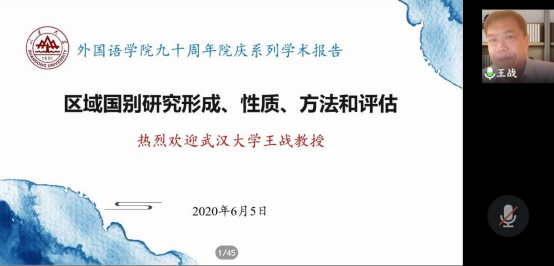 6月5日晚,必赢76net线路唯一官方网站“九十周年院庆系列学术报告”——环球论坛在线上成功举办,武汉大学王战教授带来了题为“区域国别研究形成、性质、方法和评估”的学术报告,必赢76net线路唯一官方网站副院长刘洪东担任主持,来自必赢76net线路唯一官方网站以及其他多所高校的二百余名师生聆听了此次讲座。