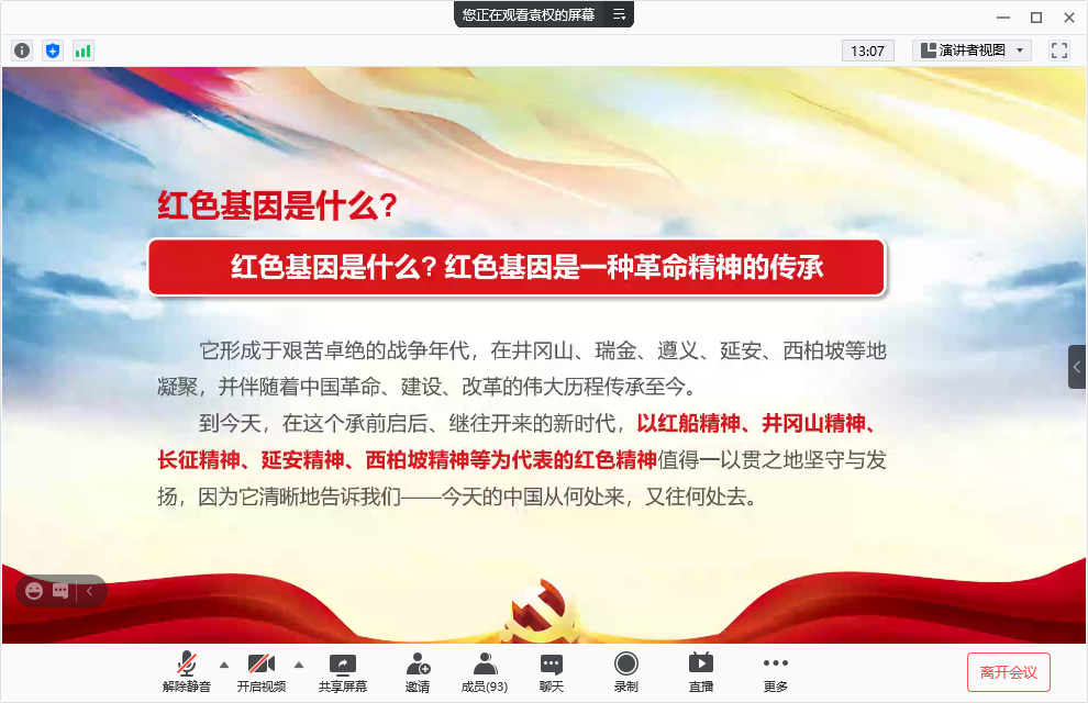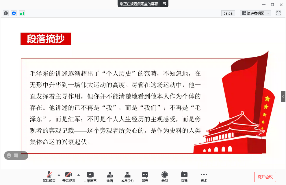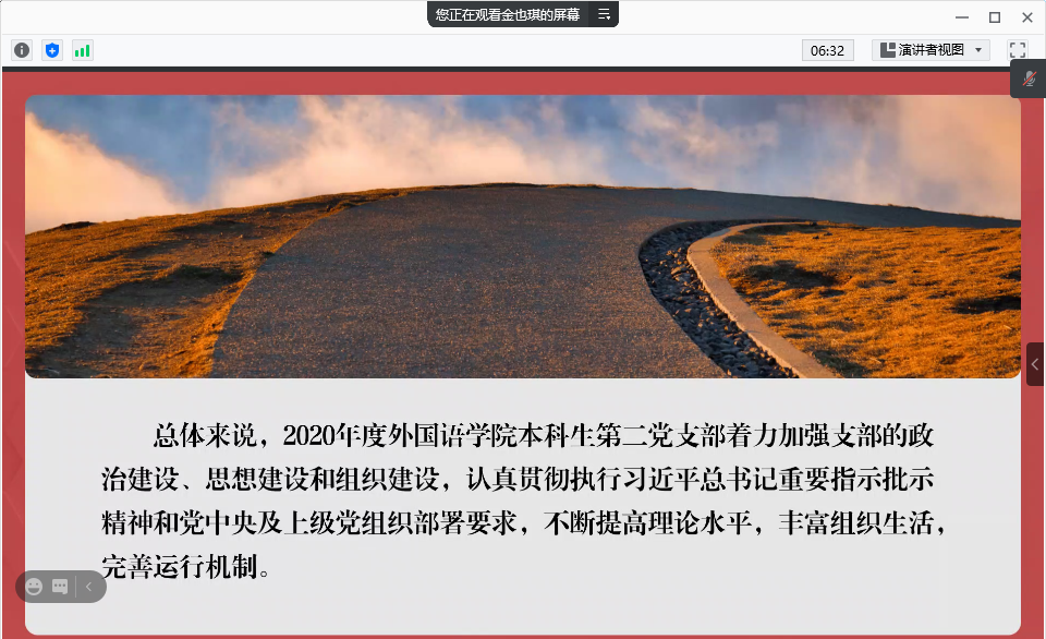 二支部一组的袁权同志带领大家学习了本书的第三篇《在保安》,本章介绍了当时中国农民运动的开展情况、党的基本政策、毛泽东对于抗日战争前瞻性见解以及人民的精神文化生活等等。袁权同志穿插补充了部分背景知识,让全体党员更加深入地了解党的政策、军事策略以及红军战士的生活。