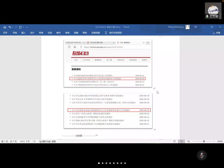 接着,王文卿作为保资保研成功的代表向大家分享了保资保研的相关经验。王文卿带领大家认真研读了2020年学校下发保资保研通知文件和报名表格,着重介绍了保资保研的信息发布时间、参选条件、以及材料的撰写,使大家对保资保研有了更清晰的认识。
