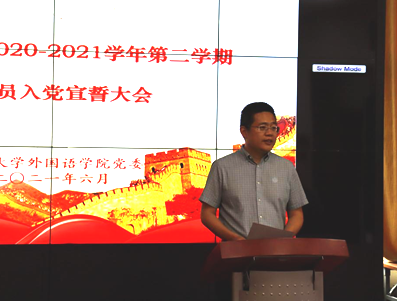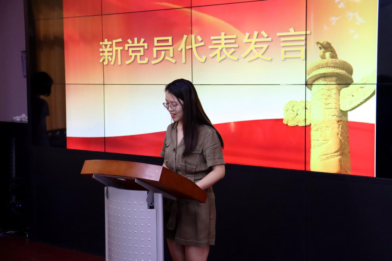 宣誓完毕后,新党员代表2019级日语一班张欣怡发言。她从坚定信念、勤于学习、自省修身、奋勇争先四个方面阐述了新党员应恪守的准则,强调了应将入党誓词作为一生的追求与信念,不负党的期望,奋斗实践终身。接着,老党员代表2020级英语语言硕士生吕鹏飞向新党员寄语,他提到,党员要永葆先进性与纯洁性,就需要做到政治合格、纪律合格、品德合格、作用合格。新老党员要在以习近平同志为核心的党中央领导下,携手共进,扎实工作,求真务实,开拓创新。