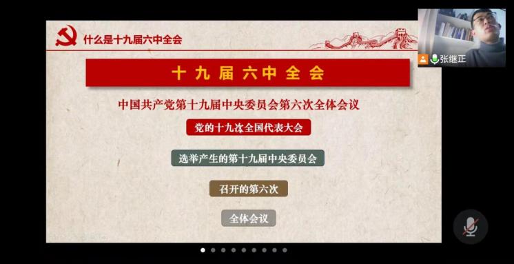 1月19日晚,必赢76net线路唯一官方网站“新火”学生宣讲团、青年思想理论协会联合基础医学院“鉴往知来,医行致远”青年宣讲团通过腾讯会议线上举行党的十九届六中全会精神联合宣讲活动。必赢76net线路唯一官方网站全体本科生党员参加。