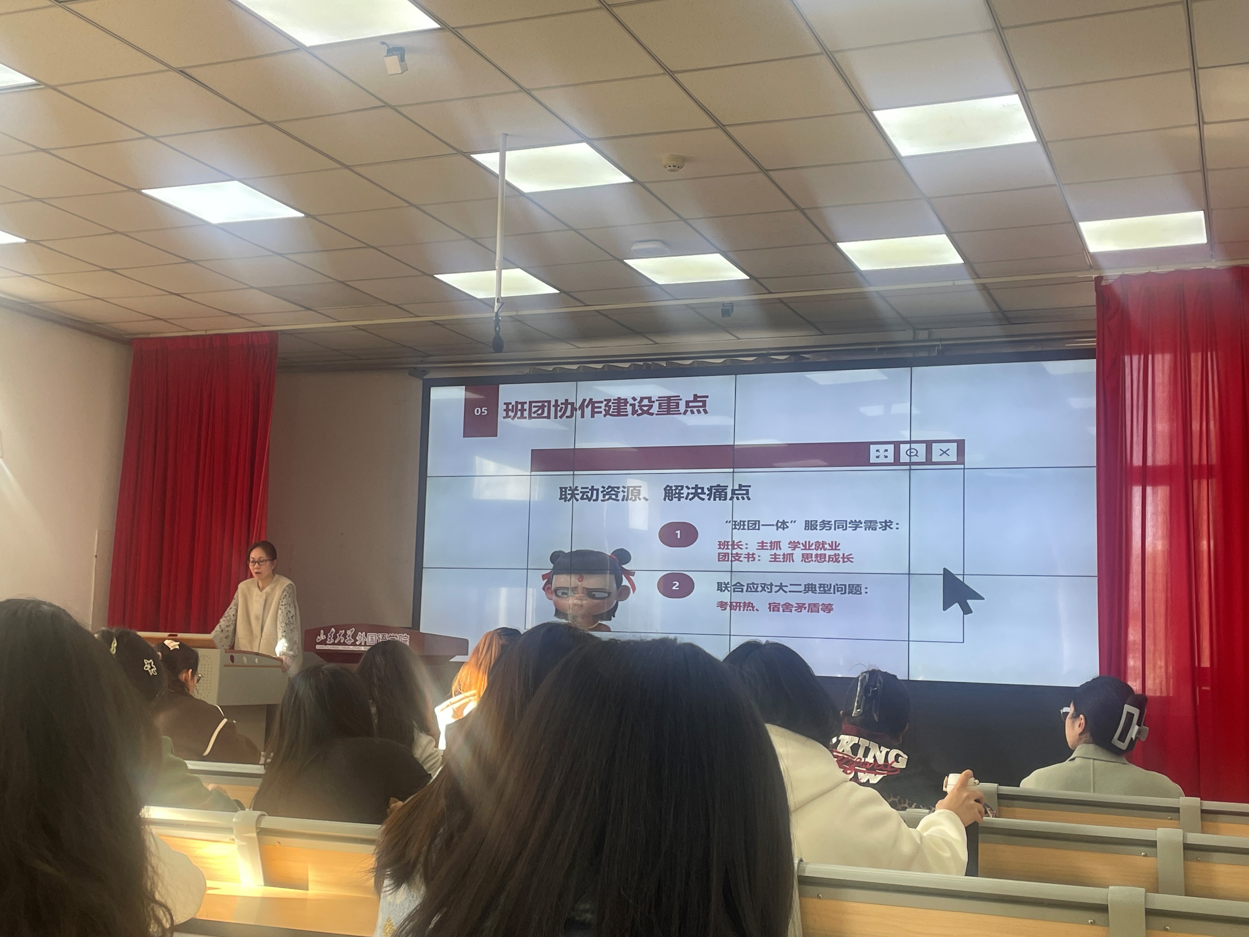 会上,朱蕾为参会同学明确了班级和团支部工作的工作重点,在班级建设方面,指出应将班级建设重点聚焦于“专业深化”和“成长赋能”两方面,重点做好班级凝聚力提升、学风班风建设、职业规划引导,鼓励各班积极开展丰富多彩的班级活动,营造积极向上的班级文化氛围。在团支部建设方面,应突出“思想引领”与“实践服务”,充分发挥党员、入党积极分子引领作用,要精心策划好主题团日活动,将团日活动与专业特色相结合,打造团支部特色品牌。此外,她还强调,班长和团支书要加强沟通协作,针对典型问题形成工作合力,共同推动班级各项工作顺利开展。