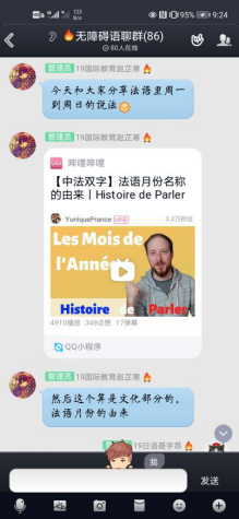7月2日,2019级翻译班的汪子彤同学创建了集英语单词打卡、小语种知识分享为一体的学习群——无障碍语聊群。在这两个月里,语聊群管理团队不断创新管理方式,精心准备了专业而有趣的学习内容,希望尽最大可能帮助同学们在假期里坚持学习、开拓视野;与此同时,参与学习的同学们都能坚持打卡,并且对小语种知识表现出了极高的热情。时光飞逝,假期已过大半。此时,默默为语聊群添砖加瓦的管理成员思绪万千。