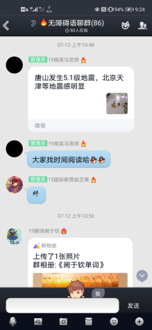 从语聊群建立时的人数寥寥无几到现在的小有规模,管理者分享语言学习资料,参与者每天积极打卡,群内气氛活跃,过程虽不能说成是坎坷,但确实也有过不易。我想说,暑期参加的这次活动,我不只是收获了知识,更多的是大家积极乐观,迎难而上的精神。目前活动已经进行到尾声,希望我可以尽自己的一份力,让活动有一个happy ending.