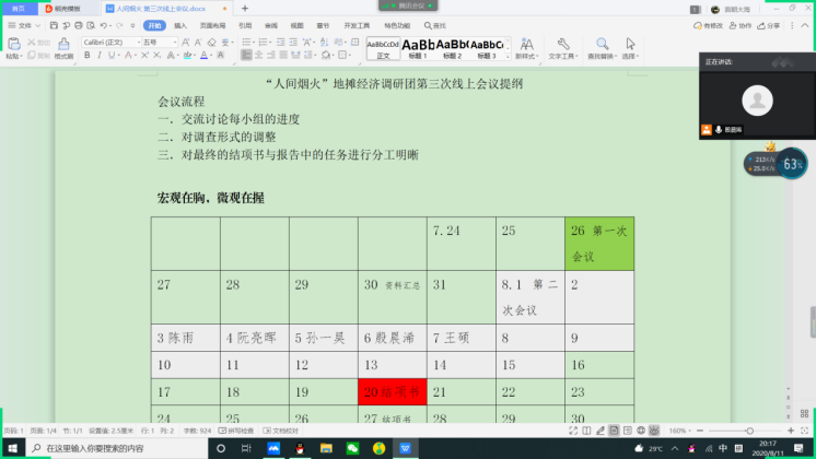 8月11日晚,为了确保暑期社会实践工作有序顺利开展,必赢76net线路唯一官方网站“人间烟火”赴鲁苏闽三省地摊经济调研团举行了自立项材料提交以来的第三次线上会议。本次会议由前期调研实践回顾、下一阶段的任务分配及暑期社会实践的结项材料撰写三项议程组成。队长殷晨浠主持会议。