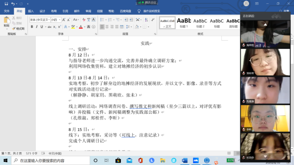 会议伊始,黑萌欣对整个实践项目的主题和目的进行了简单概括。她首先介绍了活动背景。受新冠疫情影响,我国国民经济遭到重创。缓解就业压力、推动复工复产、刺激经济发展成为国家和政府面临的紧要问题。在这一背景之下,“地摊经济”被中央郑重提出,至今全国多地出台相关政策,明确鼓励发展地摊经济,“地摊经济”成为了热门话题。紧接着,她进一步提出,在地摊经济发展如火如荼之时,更需要一些冷思考,许多问题亟待解决。“市井”暑期实践调研团围绕地摊经济这一社会热点现象,利用网络资源并结合实地考察结果,回顾地摊经济的历史发展、深入探究当今生存现状,并就其未来发展提出建议。