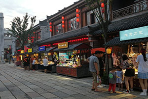 8月15日,队长黑萌欣在山东青岛进行关于地摊经济的调研。即墨古城是当地著名文化旅游景点,尤以夜市闻名。正值青岛第30届啤酒节,城内游客众多,摊位前也十分忙碌。城内地摊种类多样,销售不同类型商品的地摊按照划定区域集中分布。除了销售食品、日用品的摊位,还有众多以销售文化产品为主的摊位,也有部分实体店会在门前摆出地摊来吸引顾客。古城文化气息浓郁,特色鲜明,现场炒茶和人体素描画等创意地摊众多。城内有专门的环卫工人负责清洁,环境卫生保持较好。