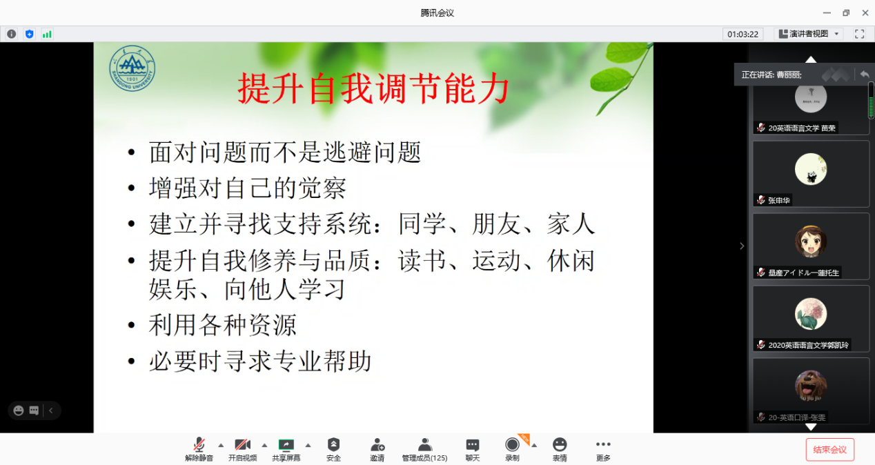 9月9日下午,必赢76net线路唯一官方网站“新生教育系列活动”之心理健康教育线上讲座顺利举办。心理健康中心曹丽丽老师受邀做客必赢76net线路唯一官方网站,通过腾讯会议线上平台为2020级全体研究生作了主题为“激扬青春·从‘心’开始”的知识讲座。本次活动由研究生会《语翼》编辑部邹丹主持。