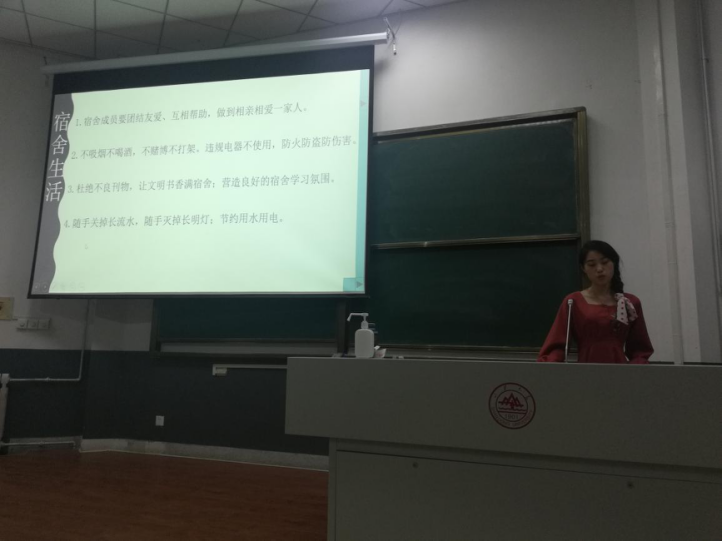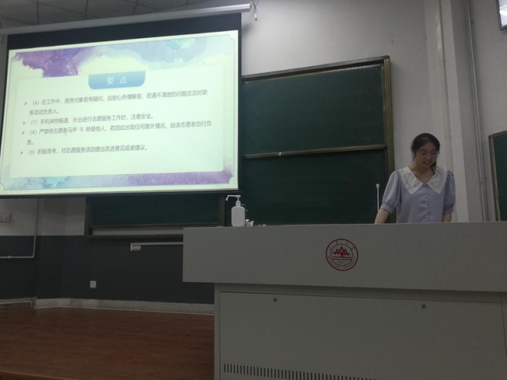 最后,殷晨浠详细介绍了志愿服务方面的知识,具体阐释了志愿活动原则、活动介绍以及志愿礼仪方面的具体要求,为学生更好地进行志愿服务活动提供了帮助和指引。