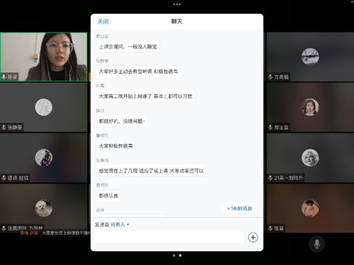 会议前期,辅导员通过学习委员征集班内同学关于改进线上教学质量的建议,全面掌握目前的学习困难。张明明在会上介绍了目前济南的疫情形势,强调了在遵守防疫要求的前提下,协助任课教师落实好课堂考勤、请假等常规事务,同学们集中反应了在线上上课期间的问题,并就如何解决交流了经验和建议。