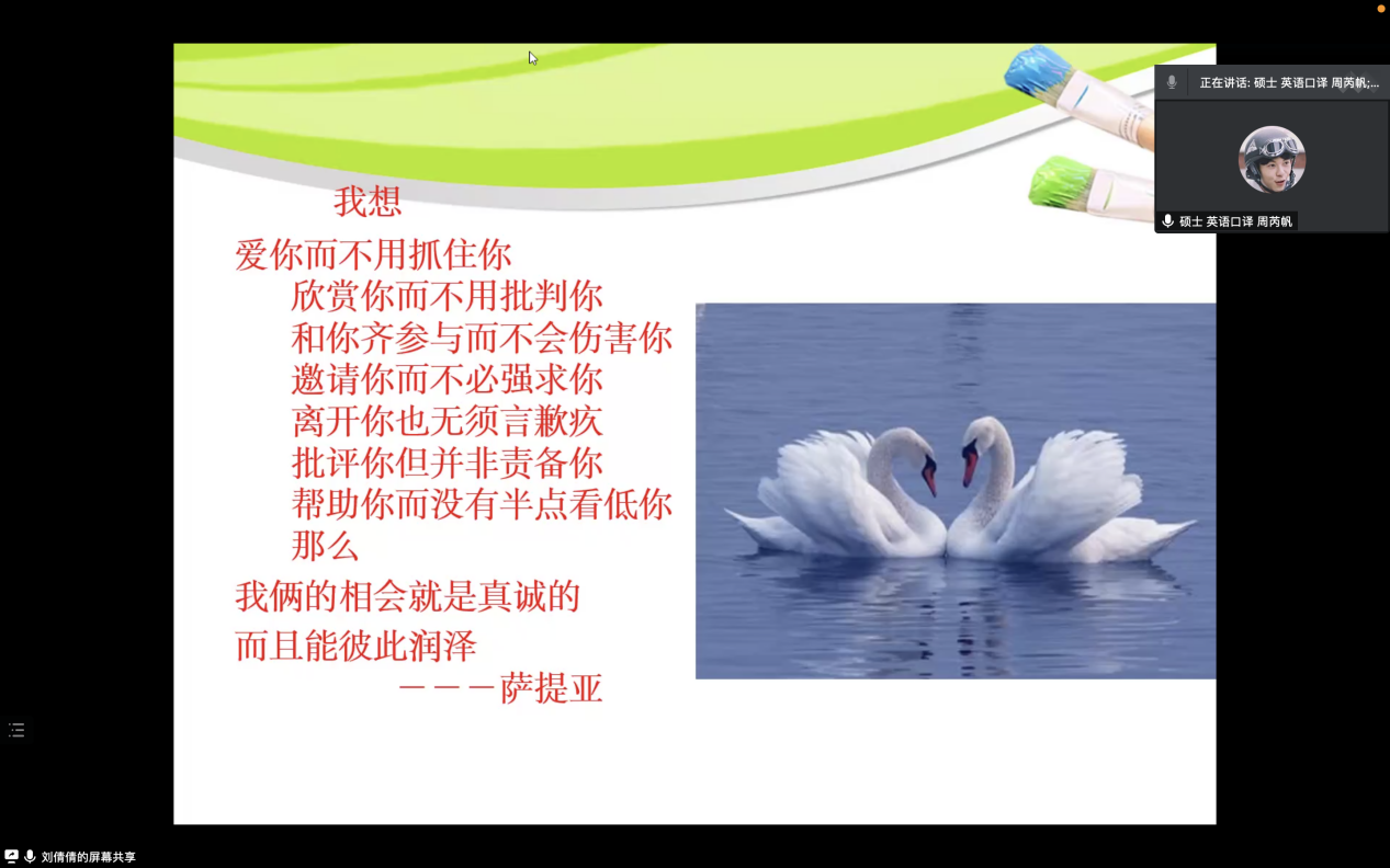 在讲座第四部分,刘倩倩老师带着同学们从心理学视角解读爱情,启示同学们在清楚探索自己的前提下才能更好地选择爱情,用发展和成长的视角来看待爱情,并设计集体互动环节,请同学们开麦朗读相关诗目,促进同学们对所讲内容有了更深刻的理解。