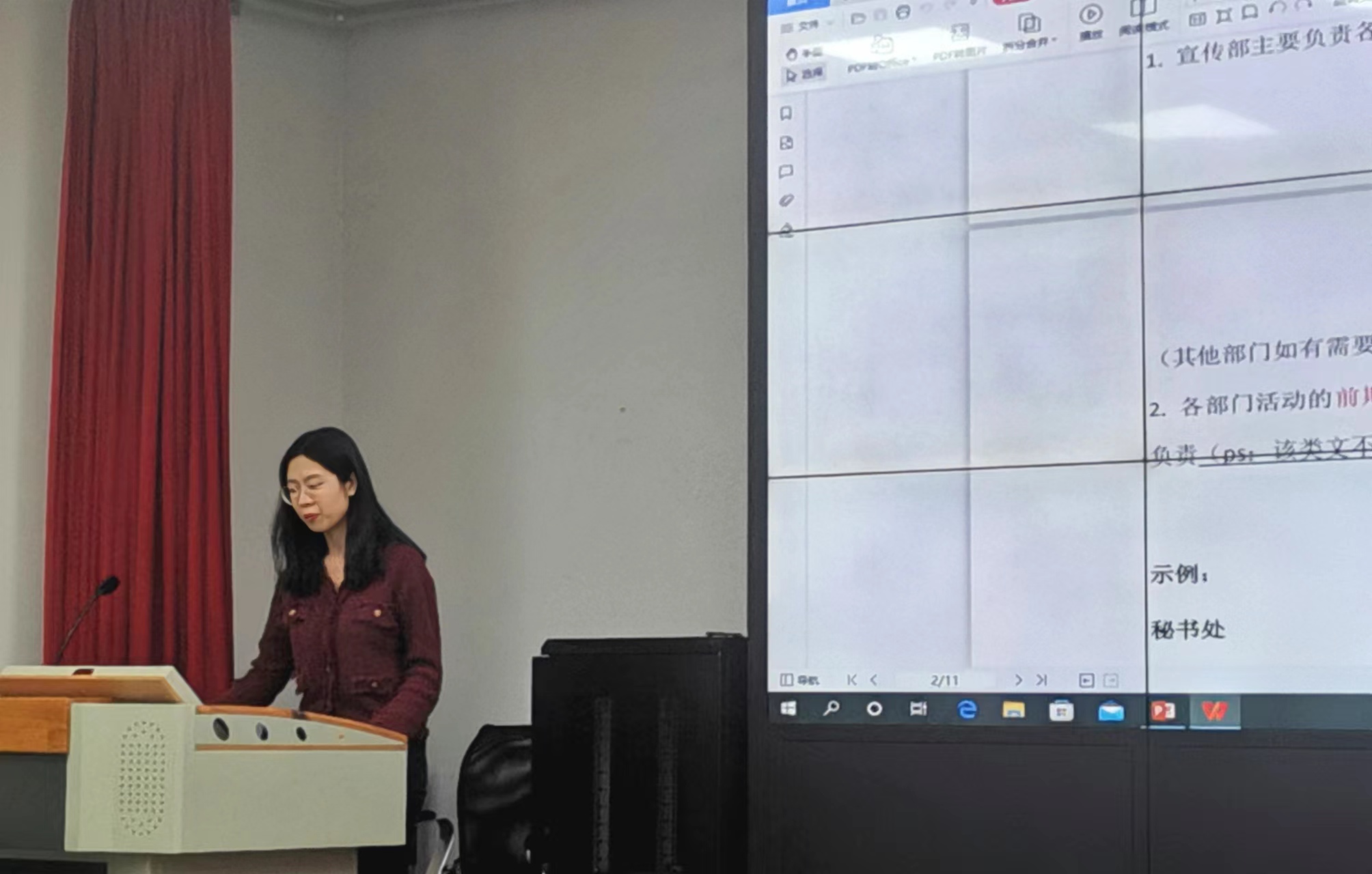 会议伊始,王新雨提出了召开本次会议的目的,希望研会成员在工作能力、工作技能、工作效率上能有所提升。本次会议共分为三个环节,分别是研会副主席徐一凡、宣传部部长袁玫静和文体部部长孟怡雯分享研会的工作流程和注意事项。