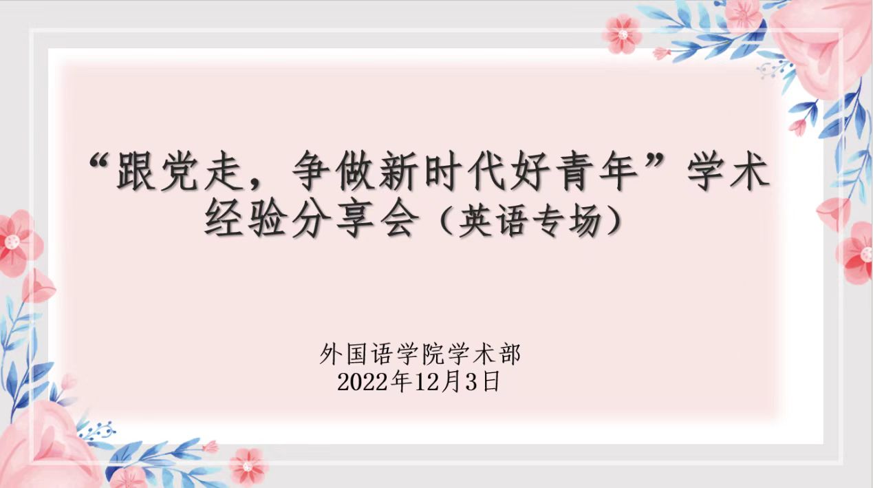 12月3日晚,必赢76net线路唯一官方网站举办了线上“跟党走,争做新时代好青年”英语专场学术经验分享会,共邀英语语言文学专业贾玉馨、外国语言学与应用语言学专业李雨纤、英语笔译专业孟怡雯以及英语口译专业徐一凡四位同学进行分享。研究生会学术部杜凯玥主持本次经验分享会。