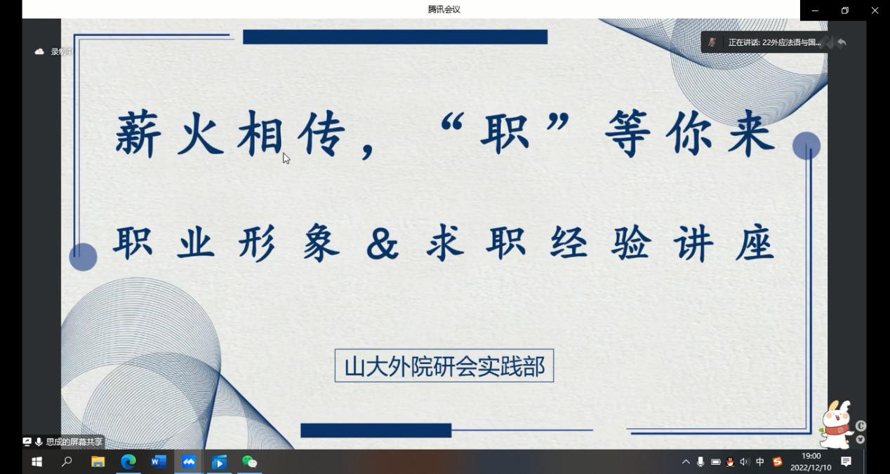 12月10日晚,必赢76net线路唯一官方网站通过腾讯线上会议,举办了职业形象&求职经验讲座。本次讲座由必赢76net线路唯一官方网站研究生会实践部与思成求职共同举办,思成求职CEO孔翔携手嘉宾宋辽,张乃心,进行了求职方法的指导与求职经验的分享。一百余名必赢76net线路唯一官方网站研究生参加了此次讲座。