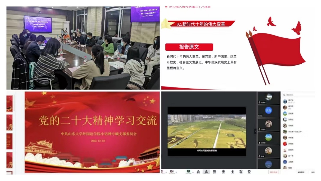 小语种学硕与国别区域硕士研究生党支部以“深入学习贯彻党的二十大精神,积极构建中国话语体系”为主题,开展“加强国际传播,构建中国话语体系”专题学习会,校党委常委、组织部部长曲明军,研究生院副院长、党委研究生工作部副部长郎剑锋出席会议,学院教师党员代表刘洪东、刘华、董记华、马蕾等以教工党员和学生党员联学共建的方式一同参加。会议聚焦文化建设,领学党的二十大报告多语种重点,并就研究生教育管理、学习科研、校园生活、服务保障等方面工作进行调研交流。外国语言学及应用语言学硕士党支部组织全体党员共同收看党的二十大直播,转发学习资料辅助党员自学,并定期在支部大会上开展党的二十大精神学习交流,将外国语言学及应用语言学的学科方向与党的二十大精神结合起来,了解党的二十大召开的时代背景和精神内涵,学习党的二十大报告中“健康中国战略”,体悟语言与健康的关系,讨论作为语言学专业的同学如何用自身的责任与担当投身于健康中国的事业。博士研究生党支部多渠道开展“云学习”,鼓励党员学中思,思中悟,定期在支部党员大会上解读党的二十大报告内涵,探讨党的二十大精神要求。同时,通过播放视频,使党员从文化、经济、乡村振兴等视角,有效学习“中国式现代化”等党的二十大关键词,在深刻理解把握党的二十大精神核心要义的基础上,联系实际开展批评和自我批评,切实把思想和行动统一到学习贯彻党的二十大精神上来。