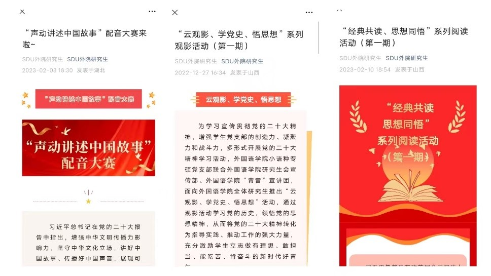 小语种专硕党支部举办“云观影、学党史、悟思想”系列观影活动,以经典红色电影为学习素材,为广大学生推介优秀经典电影,讲解电影中的党史知识故事;组织“经典共读、思想同悟”系列阅读活动以政治经济、外交政策、科教文化、社会民生四方面的经典论著为依托,深入挖掘书籍中体现的党的二十大精神和相关党史知识、历史故事等,进行经典书目推介导读。英语笔译党支部、英语口译与翻译学硕士党支部开展深入合作,共同举办“声动讲述中国故事”配音大赛,以“讲好中国故事、传播好中国声音,展现可信、可爱、可敬的中国形象”为宗旨,号召外语学子将专业学习与党的二十大精神学习相结合,为中国外宣相关素材进行多语种配音。此外,各支部积极响应校党委组织部的号召,鼓励支部内党员积极参与“学习贯彻党的二十大精神线上知识答题活动”,强化知识学习,深化内涵理解,拓宽自身视野。