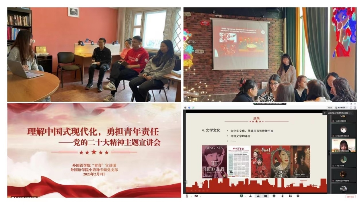 “以文弘声,以文铸魂——增强中华文化传播力影响力”主题宣讲会回顾了党的二十大概况,着重解读了党的二十大报告中关于中华文化的重要论述,介绍了中华文化对外传播现状,并为增强中华文化国际传播力影响力提出“外语人”的可行性建议。“理解中国式现代化,勇担青年责任”主题宣讲会回顾了中国共产党和中国人民为实现现代化所做的实践和探索,详细介绍中国式现代化的过去、现在和未来,并邀请研究生党员标兵吕鹏飞结合个人成长经历分享党的二十大精神学习心得体会,号召青年党员勇担责任。“激发思想共鸣,汇聚精神力量”主题交流会面向圣彼得堡各高校的中国留学生,深入学习贯彻党的二十大精神,鼓励海外学子增强文化自信,学成归国为实现中华民族伟大复兴贡献青春力量。“多元文明并置,古今文明相通”主题交流活动面向俄罗斯籍学生,传播中国优秀传统节日及习俗,以实际行动为搭建中外友好沟通桥梁,增强中华文化国际传播力影响力贡献力量。