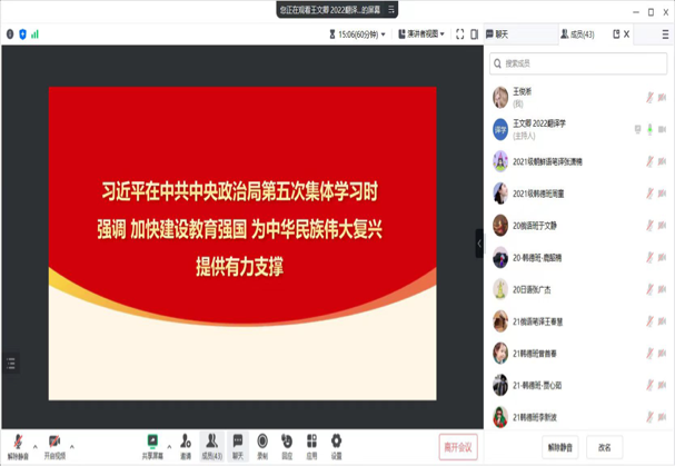 全体党员积极学习并讨论“加快建设教育强国,为中华民族伟大复兴提供有力支撑”学习内容。英语笔译硕士党支部兰海天同志表示,作为英语翻译专业的研究生,我们要用英语讲好中国故事。这就要求我们进一步地拓宽自己的知识面,具备扎实的汉语英语双语基础和文化背景知识,成为符合国家和社会需求的高层次、应用型、专业性的笔译人才,更好地让中国传统文化走出去,推动外交事业、国际传播、经济贸易更好发展。小语种专硕党支部王文卿同志表示要重视讲话中强调的教育在中华民族伟大复兴中的基础性、先导性、全局性的地位和作用,作为学生党员要响应国家号召,认真学习专业知识,提高专业素养与政治素养,不断在教育上追求新的突破;小语种学硕与国别区域硕士党支部刘三星同志认为,作为外语人,我们要深入了解和学习中国的优秀文化,打牢语言基础,练好语言本领,同时积极关注国际形势和国家战略需求,将“讲好中国故事、传播中国经验、发出中国声音”作为我们青年的使命;英语口译与翻译学党支部林佳慧同志认为作为党员应坚定不移地跟党走,在学习中,将英语翻译的学习与理解当代中国相结合,深入挖掘思考时政要素,通过传媒、经贸、科技等多个角度进行学习研究,更好地讲好中国故事;外国文学硕士党支部吴容畅同志认为要进一步加深对教育的理解,加强对建设社会主义教育强国的信念,认真学习专业知识,为社会主义教育强国建设贡献自己的理论;外国语言学及应用语言学硕士党支部马颖晶同志认为,教育要落实立德树人,努力培养担当民族复兴大任的时代新人。看到党和国家对教育青年的高度重视和殷切希望,我们更要不断学习,提高自身本领,做新时代敢于担当的进步青年。博士生研究生党支部高子迪同志表示,习近平总书记关于加快建设教育强国的重要讲话,可以更好地帮助我们认识教育在国家发展中扮演的关键角色。作为学生党员,应不断在学习和生活中锻炼自身,将能享受到的优秀教育资源转换为青年所能贡献的力量。